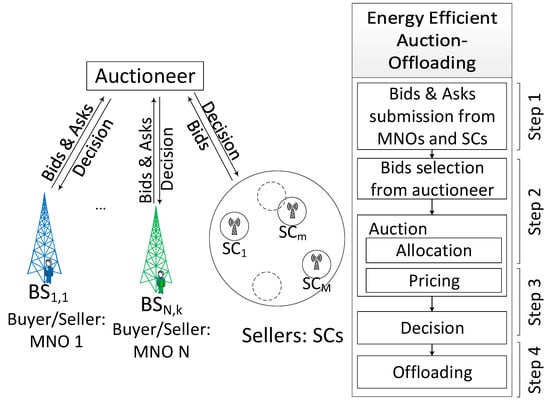 The authors in [24] propose a reverse auction-based offloading scheme for a resource allocation problem. A double auction for mobile offloading that satisfies economic properties is investigated in [25]. The objective of the reverse auction in [26] maximizes the third party’s income and a greedy algorithm is proposed to approach the optimal solution. The authors assume that through offloading, some BSs can be switched off; however, this solution can be applied to particular network and traffic scenarios and cannot be generalized in more complicated configurations. In [27], a reverse auction is applied and its goal is to minimize the total network cost; however, energy efficiency is neglected. In [28,29], the energy consumption parameter is considered in the objective function of reverse auctions. The offloading problem is formulated as a reverse auction that maximizes the revenue of the operator in [30]. Even though the experimental results of these works are promising, there are still open issues and challenges that can be explored, such as the employment of double auction.