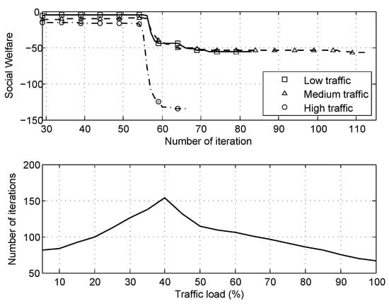 In Figure 3, first, we plot the social welfare achieved by the optimization problem P3 in each iteration and, second, we show how the number of iterations is affected by the traffic. In the first subplot, we observe that the algorithm converges to the optimal after a small number of 60 iterations. The initial values for bids and asks are randomly selected. Notice that before convergence, the social welfare can be higher than the respective optimal value due to the problem constraints. The negative value of the social welfare is explained since the third party requests higher asks for leasing the capacity than the initial offered bids. The difference between the asks and the bids is even higher when the traffic load is higher, since as the admitted traffic of a BS increases, its operation cost for admitting one more traffic unit increases even higher, due to the congestion effect and because fewer of its resources are available for serving its own traffic. For low and medium traffic, the social welfare values are very close, since we investigate a network with only two operators, a scenario that does not allow switching off of more than 1 BS and thus, the social benefit is similar for both cases. In addition, as shown in both figures, the number of iterations is highly affected by the network traffic. Specifically, from the second subplot we observe that as traffic increases reaching , the number of iterations increases, as well, since when the traffic is lower, there are more possible combinations for offloading. In contrary, the number of iterations decreases as the network traffic increases. When MNOs have higher traffic, they are not willing to admit extra traffic to serve from their neighbors and thus, the convergence is faster due to the smaller number of combinations of the optimization problem. It is important to point out that for low and high traffic, the number of iterations is small, and only when the load is medium, the required number of iterations is higher. However, for all cases the number of iterations is not prohibitive, since the offloading decision is reached very quickly in a few minutes.