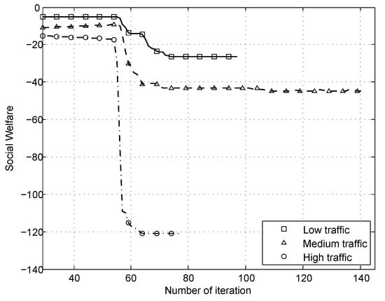 We repeated the experiment for a relatively bigger network with MNOs and SCs under various traffic conditions (low traffic around of network capacity, medium traffic around and high traffic equal to ). Similarly to Figure 3, in Figure 4 we plot the social welfare achieved by the optimization problem P3 in each iteration. We observe that the social welfare is higher as the traffic is lower, since the MNOs are given the opportunity to switch off higher number of BSs leading to higher energy and cost gains.