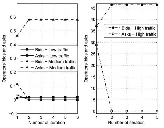 The iterative mechanism is described in detail in Algorithm 1. The auctioneer announces the Lagrange multipliers of each round to the MNOs and the third party (Step 1). Then, the involved parties calculate their bids and asks that optimize their benefits according to their own optimization problems and they submit them to the auctioneer (Step 2). The auctioneer solves the maximization problem P3 and yields the Lagrange multipliers (Step 3). At this step, the Lagrange multipliers are updated gradually through differential equations. Finally, the mechanism is repeated until convergence (Step 4). At this point, it is important to note that the algorithm is applied every hour of the day in order to decide in the beginning of the hour how the traffic can be offloaded and the number of BSs and SCs that can be deactivated. The period of the hour can be selected since the hour is the least time interval that the traffic fluctuates [13,34]. However, the algorithm can be applied in even smaller and bigger time periods according to the needs and the traffic data that are available. Thus, we can come to the conclusion that the algorithm is dynamic both regarding the traffic variations and the parameter of time.