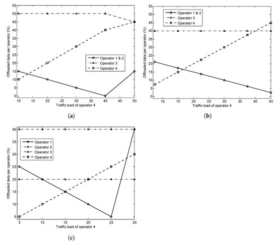 Impact of network traffic on the offloaded data of each operator. (a) Scenario 1—High traffic; (b) Scenario 2—Medium traffic; (c) Scenario 3—Low traffic.