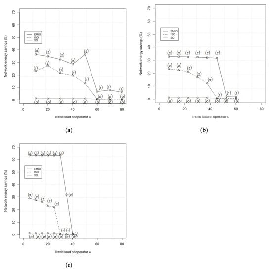 Network energy savings. (a) Scenario 1—High traffic; (b) Scenario 2—Medium traffic; (c) Scenario 3—Low traffic.