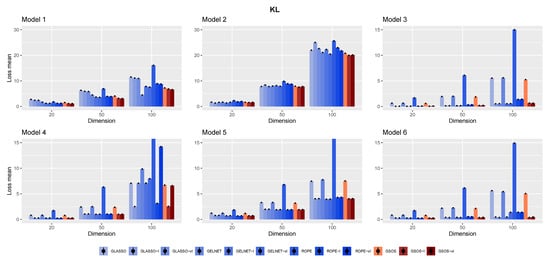 The mean of Kullback–Leibler loss for the different models and methods based on 100 replications.