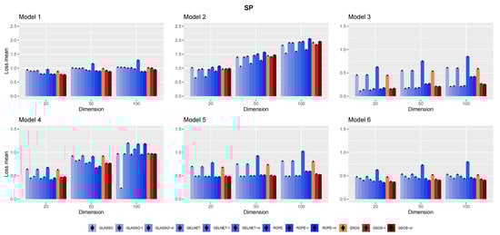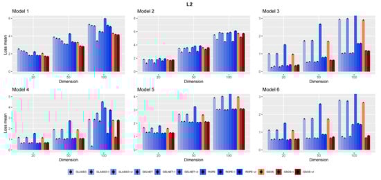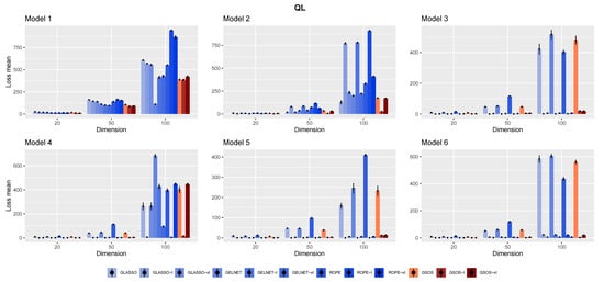 To provide risk measures, the averages of these losses are determined for each method from 100 simulations. Figure 1, Figure 2, Figure 3 and Figure 4 show the final findings. The plot layout is taken from [11]; the columns that go along the little black dots represent loss means. The bars at the top of each column represent standard errors ().