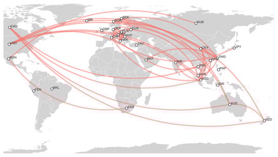 In the following section, we study market data provided by the Pacific Exchange Rate Service dataset (PERS), which is available on https://fx.sauder.ubc.ca/, accessed on 13 September 2022. PERS provides daily values of the currencies and commodities priced in various base currencies, known as numeraire. We consider 32 different currencies for the four years between 2018 and 2021. The names of these 32 currencies and their abbreviations are listed in Table 1.