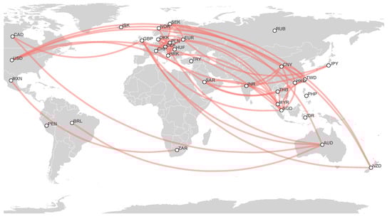We gather the data initially with the US dollar (USD) as numeraire and then, according to the initial data, calculate all currency exchange rates (for more detail, see [23,24]). After determining all exchange rates, using each of the 32 currencies as a numeraire, we compute the daily log returns of the remaining 31 currencies. We estimate the related covariance and precision matrices based on all possible exchange currencies (496 different exchanges). We apply our proposed estimator GSOS, with the scalar matrix as a target for four-year and annual data separately (the five-fold cross-validation is considered in selecting the tuning parameters). The estimated networks are presented in Figure 5, Figure 6, Figure 7, Figure 8 and Figure 9; it should be mentioned that we consider 50 of the strongest partial correlations.