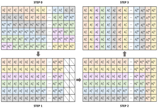 Step 0 of the Figure 1 is the initial state in which input 192 bits are stored in 6 registers. SPEEDY is divided into 32 6-bit blocks and operated. Since it does not match the register size, it can be seen that some blocks are divided and stored. In step 1, the block is sorted using only 30 bits of the register, excluding 2 bits from 32 bits. A total of 180 bits of input are stored in the registers, leaving 12 bits. The remaining 12 bits correspond to the last two blocks of 32 blocks. We implemented it efficiently by using UBFX, BFI, LSL, and LSR instructions in Cortex-M3 processor and SRLI, SLLI, and AND instructions in RV32I. In Step 2, the remaining 12 bits are filled in the 2 unfilled bits. The last block, the 32-nd block, is stored in the least significant bit of each register, and the 31-st block is stored in the second least significant bit. These values do not change until the last step.