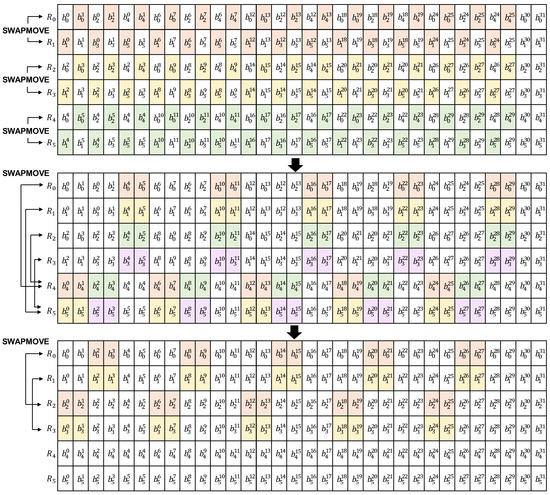 Finally, in Step 3, we use SWAPMOVE to sort by bit-slicing representation as shown in Figure 2. Initially, 15 bit exchanges are made at (R0, R1), (R2, R3), and (R4, R5). Next, 10 bit exchanges are made in the following order: (R0, R4), (R1, R5), (R2, R4), and (R3, R5). The last 10 bit exchange is done at (R0, R2) and (R1, R3).