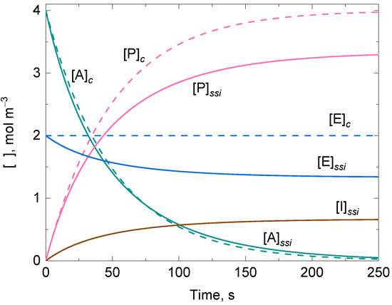 Representative approximate analytically integrated solutions of the time-dependent variation of the concentration for the participating compounds of an irreversible uni–uni Michaelis–Menten model in the absence (dashed lines, subscript c) and presence of suicide substrate inactivation (solid lines, subscript ssi) following a one-step mechanism. Initial conditions: and .