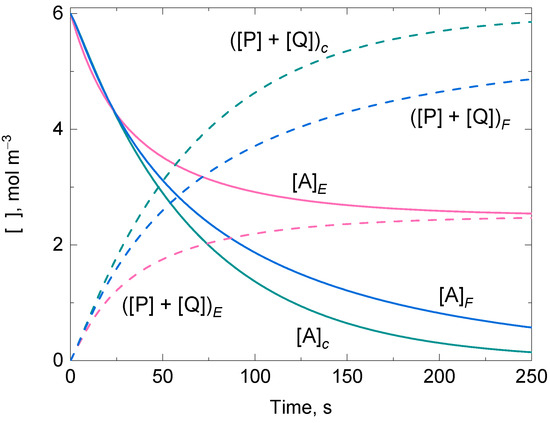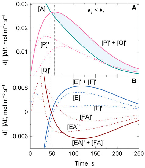 For conditions in which the substrate–enzyme complexes are not in a quasi-steady state, there is a time t for which the decomposition rate of the substrate matches the sum of the formation rates of the products (Figure 3).