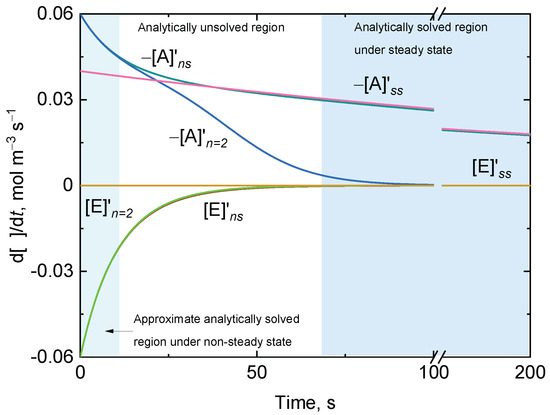 Representative numerical (subscript ns) and approximate analytical (subscript n = 2) solutions of the time-dependent variation of the reaction rate for the substrate A undergoing disproportionation and one of the active enzymes states, E, of an enzyme-catalyzed ping-pong reaction in which the substrate–enzyme complexes do not accumulate. The numerical solutions (ns) for and are shown together with two approximate analytical solutions for and in two different domains: the pale-green domain for which the steady-state approximations are not invoked around (i.e., and ) and the pale-blue domain for which the steady-state (ss) approximation is invoked (i.e., and ). The intermediate non-shadowed domain is not analytically solved. The equality holds for any domain. Initial conditions: and .
