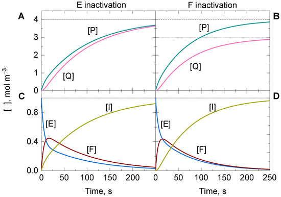 The presence of suicide substrate inactivation in an enzyme reaction with two active states opens the question of which enzyme state is inactivated by the suicide substrate and whether it can be identified. Figure 5 shows representative numerically integrated solutions for the time-dependent variation of and the sum of in a ping-pong reaction in which the substrate underwent disproportionation and steady-state conditions were not invoked. In the example, one-step suicide substrate inactivation occurred in the active state E or F following second-order reactions that did not reach saturation by the substrate (Reactions (69) and (78)). The formation of the intermediate substrate–enzyme complexes was considered negligible in Reactions (67) and (68), as well as in Reactions (76) and (77), although the conclusions here presented for the numerically integrated solutions did not depend on it. The plots undoubtedly show that the traces for and vary notably depending on the enzyme state inactivated by the suicide substrate, implying that the mathematical expressions of their approximate analytically integrated solutions should also reflect such differences.