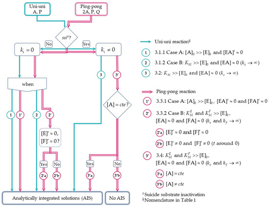 The theoretical approach here presented aims to gain deeper insight into the kinetics leading to one-step suicide substrate inactivation of a ping-pong reaction in which the substrate undergoes disproportionation and can either irreversibly inactivate the initial or the intermediate active state of the enzyme, a situation not addressed in the above enzyme inactivation scheme (Reactions (4) and (5)). To achieve this goal, the standard quasi-steady-state and reactant stationary approximations [24] were examined initially in a uni–uni reaction following the irreversible Michaelis–Menten model, and then in a ping-pong reaction with one substrate undergoing disproportionation in the presence and absence of one-step suicide substrate inactivation. Despite the complexity of the ODE system of the enzyme-catalyzed ping–pong reaction in the presence of suicide substrate inactivation, the exploratory analysis of the approximate analytically integrated solutions was shown to be of relevance to identify the enzyme state that irreversibly reacted with the suicide substrate. Scheme 1 shows the flow to achieve the approximate analytically integrated solutions of the ODE systems of enzyme reactions under investigation in the present study.