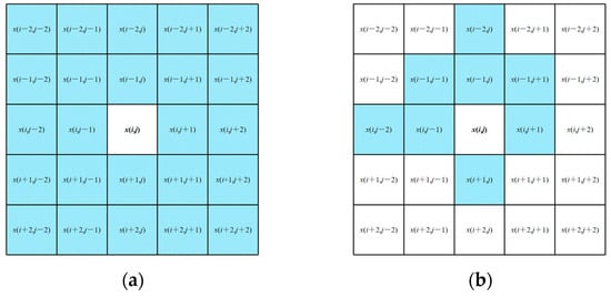 Firstly, calculate four direction gradients of the target pixel x(i,j): horizontal gradient dh, vertical gradient dv, positive diagonal gradient dpd, and negative diagonal gradient dnp by Equations (5)–(8):