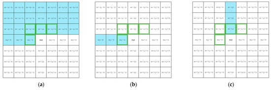 Figure 3a–e respectively illustrate the training pixel and prediction context of target pixel which belongs to the weak edge, horizontal edge, vertical edge, positive diagonal edge, and negative diagonal edge. The shadow pixels are the training pixels of the target pixel, and the 4 neighboring pixels in the green border are the prediction context of the target pixel.