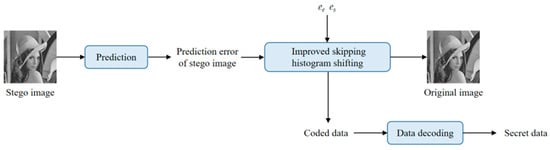 Compared with the original skipping embedding method [12], which uses only the peak bin for embedding and the skipping position is fixed, the improved skipping embedding method carefully designs the embedding position and the skipping position selection. The embedding position and skipping position are determined adaptively according to the prediction error histogram and the given payload to achieve the aim of concealing the embedding traces, ensuring that the after-embedding histogram still maintains the general shape as the original histogram, avoiding the ‘flat ground’ phenomenon and, thus, being able to resist steganalysis to a certain extent, especially for those that are HS-based, while also focusing on reducing the distortion generated in the embedding process to improve image quality.