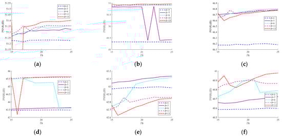 PSNR of different parameters for Lena: (a) PSNR under 0.1 bpp; (b) PSNR under 0.2 bpp; (c) PSNR under 0.3 bpp; (d) PSNR under 0.4 bpp; (e) PSNR under 0.5 bpp; and (f) PSNR under 0.6 bpp.