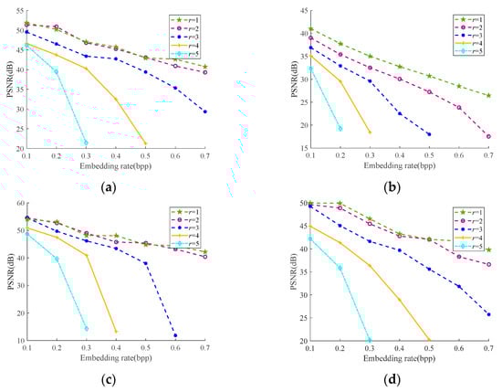 The parameter r represents the sparse rate, which will directly affect the coding rate and coding effect. Figure 8 shows the effect of r on the capacity–distortion performance of the algorithm, where r ∈ [1,5]. As can be seen from Figure 8, the algorithm performance is acceptable when r values are 1, 2, or 3. If the value of r is too large, the coded data is too long. Although the number of ‘1’s in the coding data is small, it produces a large amount of shifting distortion and loses great image quality, even the data cannot be fully embedded in the image.
