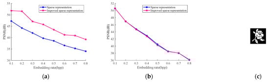 Figure 10 shows the comparisons of the bpp-PSNR performance between the sparse coding in [13] and the improved sparse coding. Figure 10a,b are the bpp-PSNR performance comparisons when the secret data is image and pseudo random number, respectively. The secret image uses the classic watermark image ‘flower’, as shown in Figure 10c, and the original image uses ‘Lena’. It is observed that the proposed algorithm with simple improvement on the sparse representation has better PSNR performance than that of [13]. The PSNR of the proposed algorithm is increased by approximately 4dB. This is because the probability of consecutive ‘0’s in the image data is too high, so that the length of the data coded by the original sparse representation is too long. When the secret data is a randomly distributed in a ‘0’ and ‘1’ binary stream, the bpp-PSNR performances of the two algorithms are basically the same, as shown in Figure 10b.