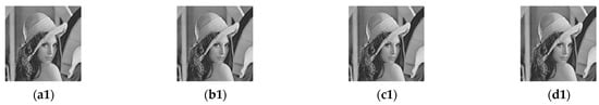 Table 1 shows the comparisons of the proportion of the original data and the coded data. Herein, the original data are generated randomly, resulting in a uniform distribution of ‘1’s and ‘0’s. For the original data, the proportions of ‘0’s and ‘1’s are each approximately 50%. After coding, the proportion of ‘0’s is up to approximately 84.6%, and the proportion of ‘1’s is reduced to approximately 15.4%. The proportion of ‘1’s after coding decreased by 34.6% compared with that before coding. The decrease in the number of ‘1’s will result in the improvement in image quality with the decrease of embedding distortion.