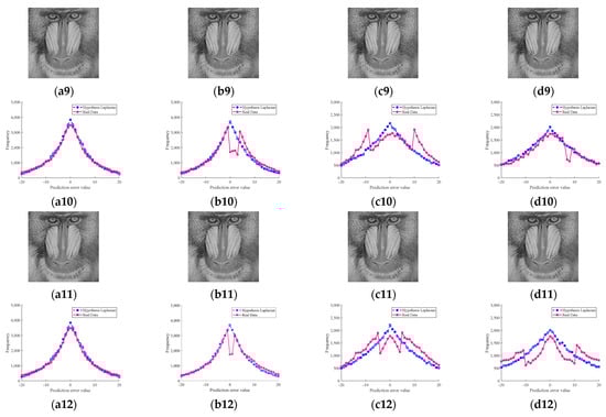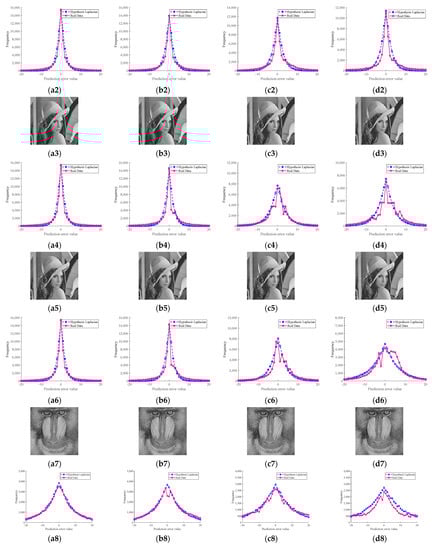 As can be seen from Figure 11, the blue line shows the hypothesis Laplacian model. The prediction error histogram of the original image is smooth, and the distribution of the prediction error can be well-fitted with Laplacian model. However, the prediction error histograms of the traditional HS algorithm and the skipping HS algorithm become more irregular, with greatly deviation from the hypothesis Laplacian model. At low embedding rates, the histograms can barely maintain a shape similar to the original histogram. However, at higher embedding rates, the middle of the histogram, which should exhibit an obvious peak, becomes a large area of flatness (‘flat ground’). The embedding traces can be obviously identified, so it is difficult to ensure the security of the data hidden in the image. Instead, the prediction error histogram of our proposed trace concealment algorithm is relatively smooth, which resembles the original histogram. Even though the prediction error histogram inevitably becomes flatter after data embedding, it still preserves the bell-shape resembling the Laplacian distribution, thus achieving the purpose of concealing the embedding traces. The trace concealment effect in Baboon is not as good as that in Lena because the number of adjacent prediction errors in the prediction error histograms for such complex textured images is not much different; thus, it is more difficult to keep the histogram smooth after hiding data, but the proposed trace concealment algorithm is relatively better than the other two algorithms.