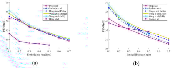 The proposed RDH scheme focuses on not only improving anti-steganalysis ability but also on capacity-distortion performance. The proposed scheme considers two embedding distortions that lead to the decreasing image quality of the HS algorithms: reducing the expanding distortion by the improved data coding method and reducing the shifting distortion by the improved skipping embedding strategy. Moreover, due to the application of the improved data-coding method, the skipping distance is increased, which further highlights the advantages of skipping embedding in reducing shifting distortion. Figure 12 shows the capacity–distortion performance comparison results, including the rhombus predictor with sorting technique (Sachnev et al.) [5], LP (Dragoi et al.) [6], ridge regression predictor (Wang et al. (Ridge)) [9], multiple histogram algorithm (Wang et al. (MH)) [10], and trace concealment algorithm (Dong et al.) [19]. The slightly worse capacity–distortion performance of proposed algorithm at 0.1 bpp in the Figure 12 is due to the fact that, at low embedding rates, there is no expandable bin in the prediction error histogram similar to length of the payload. Therefore, the embedding position selected may be closer to the middle of the histogram, resulting in more unnecessary shifting distortion. Thus, the worse capacity–distortion performance at the low embedding rate that does not occur in all images, but usually in smooth images, is unexpected. As can be seen from Figure 12, compared with the state-of-the-art algorithms that focus only on improving capacity–distortion performance, our proposed algorithm achieves similar capacity–distortion performance and superior anti-steganalysis ability. Moreover, compared with the trace concealment algorithm in [19] that loses too much image quality, our algorithm also achieves superior image quality.