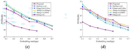 The capacity–distortion performance comparison: (a) Lena; (b) Baboon; (c) Airplane; (d) and Boat.