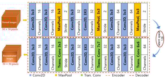 Figure 1 shows the overall CAE architecture. CAE consists of encoder and decoder parts. the CAE input images are normalized images ranging from 0 to 1 with a size of 50 × 50 pixels, and the images are normal images with no light emission. In the encoder, representative features of the input images are extracted, and the feature dimensions are reduced as the images pass through the three modules, which are two convolutional layers and one max pooling layer. In order to minimize information loss caused by the dimensionality reduction, the number of channels of the convolutional layers are doubled every time it passes through the modules. After passing through the last module’s max pooling layer, the features pass through one additional convolutional layer and the features are compressed into 128 dimensions in the latent space. In the decoder, the encoded features are reconstructed into the input image. The reconstruction process involves the passage of the three modules which are one transposed convolutional layer and two convolutional layers. The number of channels of the transposed convolutional layers are reduced as half. After passing through the last convolutional layer of the decoder, the input images are reconstructed by one additional transposed convolutional layer. For training of the CAE, Mean Squared Error (MSE) was adopted as a loss function and the Adam optimizer was used to minimize the loss function. MSE can be calculated by dividing the sum of the reconstruction errors of all images by the total number of images. MSE can be defined as follows: