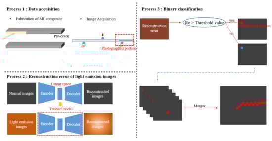 The proposed method of ML image-based delamination detection is divided into the data acquisition process, including the fabrication of ML coated composite laminates and image processing of the acquired data. Figure 2 is a brief diagram of the ML image-based delamination detection method, which consists of three steps. In the first step, ML coated composite laminates are fabricated and images are obtained with a camera when a bending load is applied to the composite. In the second stage, feature extraction is performed on the images without light emission using Convolutional AutoEncoder (CAE). Then, the light-emitted images are entered into the trained CAE model, and the reconstruction error images are calculated by obtaining images that are not well reconstructed as results. In the third step, a threshold value of reconstruction error is extracted from the reconstruction error images and a binary classification is carried out for each pixel based on the threshold value. After classification, the location of the composite delamination is extracted by merging the classified images.