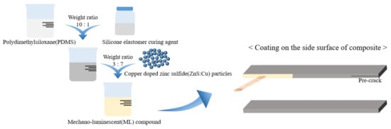 To overcome this problem, research has been actively pursued over the past few decades to develop non-contact sensors using mechanoluminescent (ML) materials. The ML sensor was fabricated in the form of a thin film by spraying a mixture of inorganic ML microparticles and transparent resin onto the substrate []. The airbrush allows the ML thin films to be freely coated onto complex surfaces. ML particles embedded in the ML sensor coating are subjected to mechanical stimuli, experienced by the ML sensor coating and consequently emit light. The ML light intensity was shown to vary in tandem with the extent of the mechanical stimuli, such as tension, fracture, impact, and pressure []. The ML light sensor signal can be measured in a real time to produce optical images with a camera. Accordingly, the ML sensor coating emits visual non-contact sensing information in the ML light, which can be used to understand the physical phenomena on ML-coated structural surfaces []. To harness the unique multi-physics ML characteristics, many different physical sensors were developed using ML materials, such as a strain sensor [], a stress distribution sensor [,,], an impact sensor [], a torque sensor [], and vibration sensor []. Further, there are several researchers who have investigated the use of ML materials for crack detection because the ML light intensity is much brighter at the crack tip to generate a high signal-to-noise ratio [,,,,,]. The research was conducted in order to detect the cracks propagation and delamination in the adhesive layer of the double cantilever beam (DCB) using the unique ML feature []. However, relatively less attention has been paid to the use of ML to detect delamination between the laminated fiber layers of the composites.