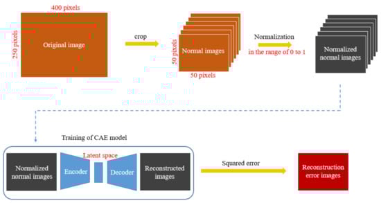 Figure 6 shows the process of obtaining reconstruction error images that indicate portions of light emission. The process of acquiring reconstruction error images consists of four steps. In the first step, the original 250 × 450-pixel images obtained with the camera are cropped into images of the same 50 × 50-pixel size. This is to increase the number of images and divide the original images into square images suitable for CAE training. Through this process, 1000 images obtained from each of the two specimens are augmented to 40,000 images with a size of 50 × 50 pixels for each specimen. In the second step, the cropped 16-bit grayscale images, which consist of pixel values in the range 0 and 216 − 1, are normalized to the range 0 and 1 for efficient computation. In the third step, CAE training takes place with the use of a prepared data set. The training dataset consists of 40,000 images of a normal specimen, and this is to learn the optimal parameters of the CAE model to reconstruct images that do not emit light. The model trained in this way produces a high reconstruction error for images in which light is emitted. The pixel reconstruction error is defined as follows [].