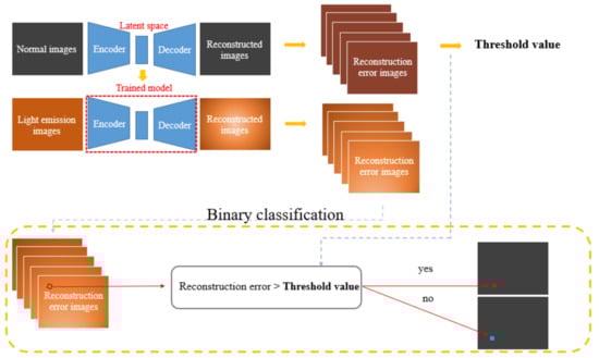 The binary classification proceeds in two steps. In the first step, a threshold value is determined based on the reconstruction error images obtained in Section 2.2, and this threshold value determines whether the pixel is emitting light. The threshold value is entirely user-defined and is carefully defined based on whether the light-emitting part is properly segmented when removing noise from an image. In the second step, the CAE model is used to create the reconstruction error images of the defective images, and the reconstruction error images are obtained in the same process as in Section 2.2. After that, all pixels of the reconstruction images are classified based on a predefined threshold value. As a result, pixels that are larger than the threshold have the same value of 1 at their respective positions, and the remaining pixels are mapped to 0.