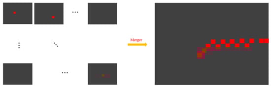 The classified images are 50 × 50 pixels in size. The cropped images must be merged after binary classification and restored to the original image size to specify the delamination location in the original image. Figure 8 shows a schematic process for combining classified images. The 40 images from one original image, which is 250 × 400 pixels, are returned to their respective cropped positions, and the combined image as a result of this process becomes a binary classification image that determines the location of the delamination in the original image. The merged image is an image in which the pixels corresponding to the delamination location have a pixel value of 1, and the rest of the pixels have a pixel value of 0.