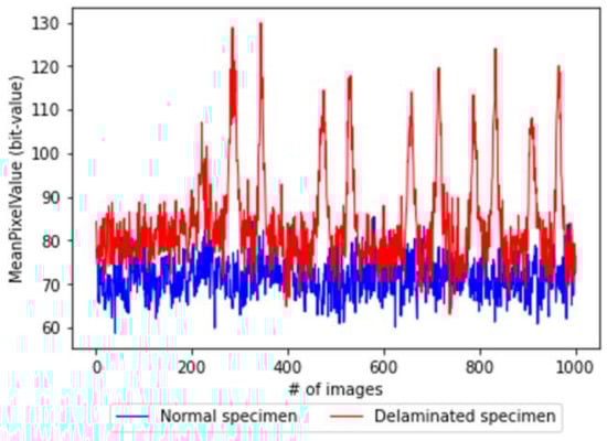 MPV can be calculated by dividing the sum of all pixel values by the number of pixels and MPV is between 0 and because all images are 16-bit grayscale images. As shown in Figure 9, the MPV of the defective images is confirmed to have several peak values that cannot be observed in the normal images. Since the presence of pre-crack is the experimental variable, several peaks show that the ML sensor repeatedly emits light during the loading and unloading cycle at the delamination location.