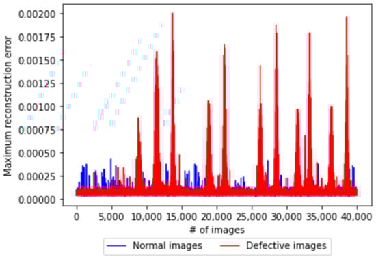 Based on the CAE characteristics the reconstruction error images were obtained as described in Section 2.2, among which the reconstruction error images for the normal dataset were used to extract a reconstruction error threshold value that can classify the pixel light emission. Figure 11 shows the maximum reconstruction errors of the reconstruction error images for each dataset. As can be seen in Figure 11, it is confirmed that the maximum reconstruction errors of defective images have several peaks that cannot be detected in normal images. The peaks are analogous to the MPV peaks in Figure 8. It can be analyzed that the trained CAE shows high reconstruction errors for the light emission images. To classify light emission in pixel units, the threshold value was selected from the maximum reconstruction errors of normal images in Figure 11. In this study, the threshold value was set with an increase from the mean value of the maximum reconstruction errors for normal images to their maximum value. Finally, the threshold value was set to 1.5 times the mean value, which can eliminate noise while detecting pixels with low light intensity. After selecting the threshold value, the reconstruction error images of the defective images were classified in pixel units, and pixels with reconstruction errors greater than the threshold value were classified as 1, and the remaining pixels were classified as 0. Then, the classified 40,000 images were merged to their original size to finally obtain a total of 1000 classified images.