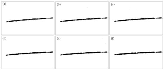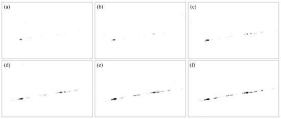 Figure 12 shows some of the CAE classification results, and the classified images are six consecutive images when the first load is applied to the pre-fracture specimen k. The clustered pixels of the classified images indicate the location and start time of delamination. Furthermore, the classified images show that only the delamination portions are segmented during noise removal by a threshold value extracted from CAE. Figure 13 shows the sequence of six consecutive images when the first unload is applied to the specimen. More pixels are classified in the first unload cycle because sufficient delamination has already occurred. These results show the CAE characteristics where the reconstruction error is increased in the defective portions of the image.