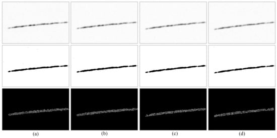 Figure 14 shows the comparative results of the different detection methods. In Figure 14, the numbers in the first row are the gray images for the four consecutive original images in the second load cycles. The images in the second and third rows are the result images obtained by CAE and Canny edge detection, respectively. As can be seen in Figure 13, the gray images for the original images demonstrate the relative pixel intensities at the delamination location, showing that non-contact detection of composite delamination is feasible using an ML sensor. However, the delamination location in the images can be manually identified by a person and the use of image processing techniques is essential to build an automated detection system. Canny edge detection method results show good performance in detecting edges in light-emitting portions while removing noise from the original image. However, the results show that light-emitting parts can only be detected as multiple edges. For that reason, edge detection detects all pixels with larger gradients as edges. Therefore, in the edge detection method, the undetected pixels exist between edges in the light emission part. Whereas, it can be seen that the results using CAE minimized the number of undetected pixels by showing the spatial information of the light emission portions as a cluster. In addition, CAEs show good performance in eliminating noise from the original images.