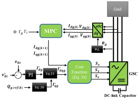 Usually, GSC serves the purpose of stabilizing the DC-link voltage in case of faults or load variations on the grid side. The FCS-MPC controller in this study regulates the active and reactive power as well as DC link voltage by controlling d-axis and q-axis grid currents. Using (10) and (11), the discrete-time conversion of the dq-frame grid current is specified as follows [35].