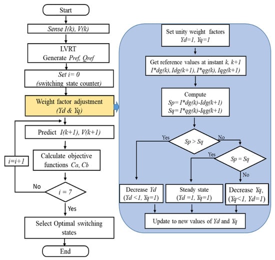 The WFs in the cost function adjust the control objective to achieve an optimal output value. During steady state condition, a unity value is assigned to both the weights, as there is no change being detected. It is during the transient state when lower priority is granted to the term by dropping its weight factor, which is negatively affecting the cost function. This is further described in the flowchart in Figure 6, where a cross-coupling term is diminished by weight factor reduction.