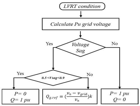 where is nominal grid voltage, shows grid voltage in case of voltage dip, and k is the droop constant with its value not more than 2 [39]. The flow chart for the LVRT process is presented in Figure 7.