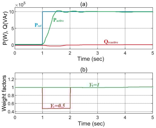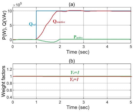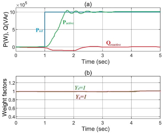In this scenario, the decoupling ability is investigated with WFs fixed at unity, with a step change of 0 to 1 MW in reference active power , whereas the reactive power reference is fixed at zero. During the transient period, the Q component experienced an unwanted cross-coupling in the case of fixed WFs. The cross-coupling on Q sustains for around 2.3 s, as shown in Figure 8a.