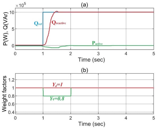 In this section, the FCS-MPC transient performance is examined in an alternative operating scenario, where is suddenly changed from 0–1 MVAr, while keeping at zero. Transient responses were examined with fixed and variable WFs, and the results are presented in Figure 10 and Figure 11, respectively. FCS-MPC systems with variable WFs experienced a settling time of around 0.4 s, which is less than the case of fixed WFs systems, where it is around 0.9 s.