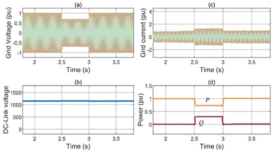 In comparison to FCS-MPC, the conventional PI control method does not exhibit a satisfactory transient response, with the DC-link voltage ripple reaching 1490 V, as depicted in Figure 14b. Moreover, the PI controller fails to ensure optimum reactive compensation, with added delay to reach the steady-state value after the fault clears (Figure 14d).