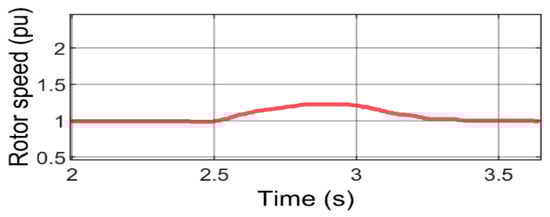 Symmetrical voltage fault of 30% (0.3 p.u.) of grid voltage is introduced for 0.5 seconds i.e., from t = 2.5 s to t = 3 s, as presented in Figure 12. The three-phase grid voltage and resulting grid current waveforms during grid voltage sag are depicted in Figure 12a. During nominal grid conditions before the 3-phase fault, the active power is generated at 1 p.u., while no reactive power injection is done from the PMSG by keeping at zero. As the voltage dip occurs at the PCC, Figure 12b shows that the DC-link voltage is regulated at the reference value of 1150 V by virtue of the proposed MPC scheme. During the voltage dip on the grid, the active power reduces in relation to the voltage drop, as a mismatch of mechanical generated power and electrical supplied power happens. Figure 12d depicts the reactive power injection to support the grid in accordance with (27), as active power decreases during fault. Execution of this limitation scheme provides the supplementary capacity to GSC for reactive power injection for grid code compliance. The proposed MSC controller in this case regulates the generator speed so that it keeps the value of DC-link voltage near the reference value. Moreover, the system inertia takes care of the power mismatch with increased mechanical speed as shown in Figure 13.