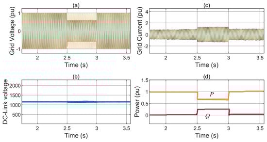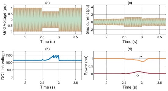 The time and severity of the asymmetrical fault remained similar to the previous case. In the case of asymmetrical faults on the grid, a performance comparison of the proposed MPC controller is examined, as shown in Figure 15. Note that DC-link voltage remained stable with reduced fluctuations as shown in Figure 15b. The proposed controller is faster than the PI scheme in providing reactive power compensation is supplied to the grid as active power decreases with increased grid current due to the faulty condition.