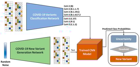 For decades, entropy has been considered an effective method to predict uncertainty and disorder in a given probability distribution [26]. In the proposed framework, we used it to predict uncertainty in the classification of COVID-19 variants. For instance, if the predicted probabilities of a classification network are equally distributed among (more or less) all variants, it means that the given input is not from any of the trained classes in the network. Furthermore, it is obvious that the difference between these variants is very small; however, with the generalization ability for unseen data of the proposed classification network, we can achieve a confidence score greater than 90% for the correctly predicted class. This helps us to differentiate between seen and unseen variants of COVID-19. The class uncertainty U is calculated using Equation (2), where c is the class predicted probability and i is the class index.
