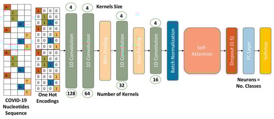 The proposed classification network consists of four 1D convolutional, two pooling, batch normalization, self-attention, dropout, fully connected, and Softmax layers, as visualized in Figure 2. The kernel sizes in the convolutional layers are kept at four due to the number of characters—‘A’, ‘C’, ‘G’, and ‘T’—which assists the proposed network in learning the patterns between them. The convolutional layers consist of 128, 64, 32, and 16 learnable kernels. The max pooling layer with a kernel size of four is added to reduce the dimensions of the feature for efficient processing. The batch normalization layer is added to avoid overfitting and achieve better performance. These normalized features are then passed to the self-attention layer. Furthermore, a dropout layer with value = 0.5 is added after the self-attention layer to regularize the network and generalize it for unseen data. Then, a fully connected layer yields logits for the number of output classes propagated forward to the Softmax layer to obtain the final predicted probability values.