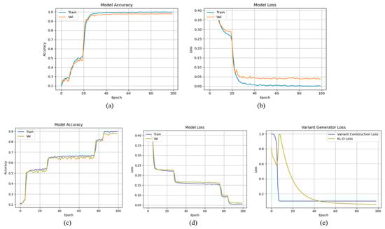 The training and validation performance recoded during training epochs: (a) accuracy for nucleotides, (b) loss for nucleotides, (c) accuracy for protein, (d) loss for protein sequence data, and (e) shows the new variant construction loss.