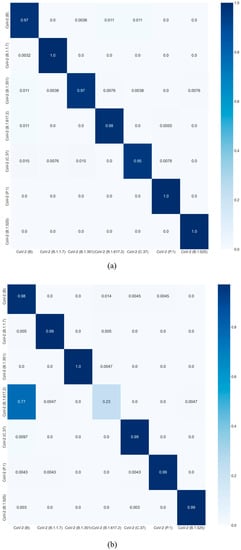 The confusion matrix attained using the proposed attention-CNN for the test set of (a) nucleotide sequences and (b) protein sequences.