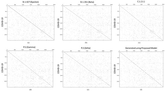 The proposed new variant generation technique is evaluated using dot plot similarity [33] and Needleman–Wunsch [34] sequence alignment methods. The dot plot finds similarity between two sequences by arranging one sequence on the horizontal axis and the second sequence on the vertical axis of the plot. When the residues of both sequences match at the same location on the plot, a dot is drawn at the corresponding position. Note that the sequences can be written backwards or forwards; however, the sequences on both axes must be written in the same direction. The closeness of the sequences in similarity will determine how close the diagonal line of the sequences is. The dot plots for COVID-19 and its different variants are given in Figure 6a–e, while the dot plot between COVID-19 and the generated sequence from random noise using the proposed method is given in Figure 6f. The reason for drawing dot plots between other COVID-19 variants is to show the matching patterns between the variants and the generated syntactic variant. As mentioned earlier, the diagonal line indicates that there is probably a good alignment between sequences, and the other positions show different kinds of mutations in the original sequence.